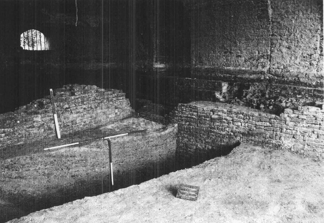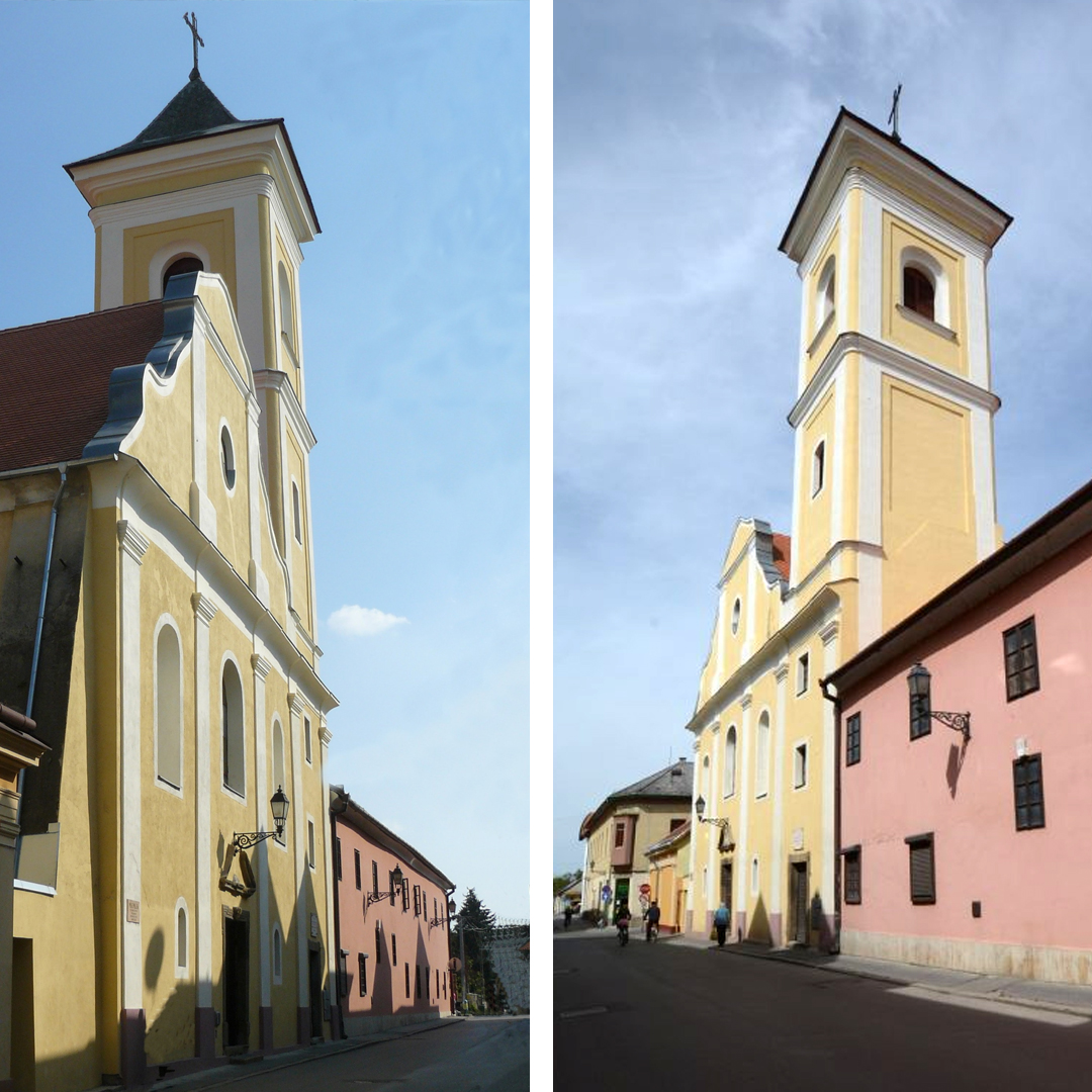 A négyszögletes lovagvár sarkához épült, a becslések szerint 24 méter magas torony. Tetején óra mutatta az időt, és innen kémlelte a környéket a vár őrsége is. Belsejében puskaport tároltak. Istvánffy Miklós a 16. század végén „az vár közepin levő kerekded és téglából rakott torony” formájában említi az épületet. A torony, Kováts Valéria régészeti ásatásainak tanúsága szerint, később épült a várhoz. „… a támpilléres vár alapfalait lapos, keskeny, hosszú téglákból készítették, … a toronyhoz felhasznált téglák más típust mutatnak, kisebbek, vastagabbak, zömökebbek.„